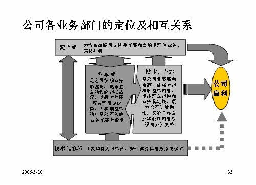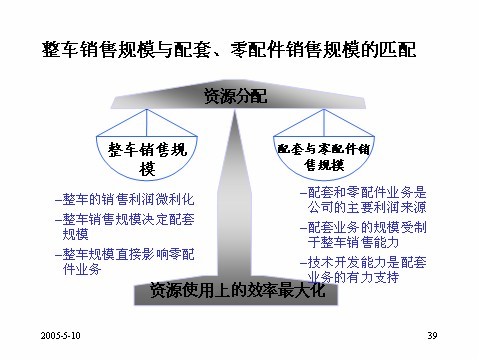 分析后发现:按公司各部门的定位,配套及零配件业务是公司的主要赢利来源,资源分配不足,将降低公司的赢利。而整车销售虽然是公司的基础性业务,但却是微利的,如果规模过大,会过多的占用公司有限的资源而影响赢利性高的业务。