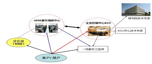 特别要提的一点是,三一花巨资精心打造的企业控制中心(ECC),由智能设备管理系统、服务管理系统、运营控制平台构成,运用了人工智能GPS、GIS遥感技术及流媒体等最新技术,改变了业界客户直接求助一线工程师的传统模式,创造性的实现了天地人合一,一、二、三线服务工程师和技术专家的协调服务体系。【见下图:三一重工的服务网络架构】