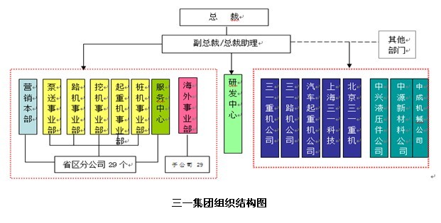 三一在全球设有多个研发、制造、服务和营销机构,国内各省区都设立有分公司,分公司独立注册,作为总部营销决策的执行机构,同时也是区域业务开展的决策和执行机构,分公司承担经营业绩指标,接受总部对人、财、物资源及业务活动过程的监督。另外,三一在国内设有许多个6S店,这些6S店得职能包括销售、零配件、售后服务、信息反馈、产品展示和专业培训,三一的6S店风暴让行业内外震撼。