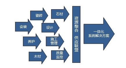 通过外部资源整合、供应端口的战略联盟,将客户所需要的资源以最终装饰效果为目标呈现在客户面前,形成系统方案,真正为客户提供一条龙式的整合服务。