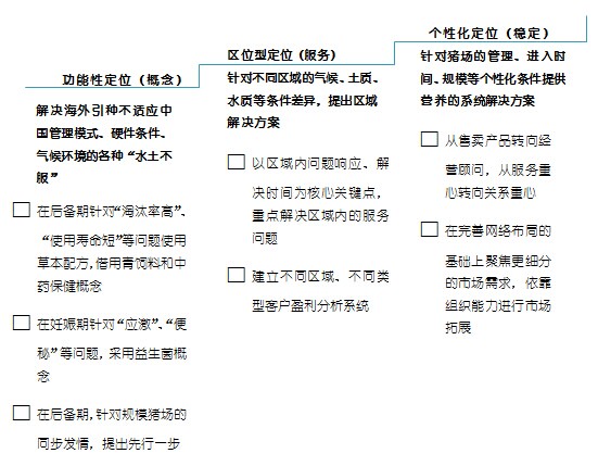功能性定位是针对以外国品种、期望更高效益的用户来说,该品牌是一个以因地制宜为核心价值,理性、进取、专业的解决外国引种水土不服的专家,它能使用户改善养猪效益,更适应中国的管理现状、硬件条件以及气候环境,因为它具有特殊的草本配方、特定的微生态、国际化机构信任背书。