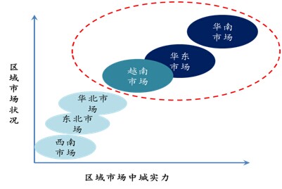 南方略顾问团队在对各主要区域市场进行调研分析后,按照区域市场发展状况和中城在区域市场的实力两个主要因素,对区域市场进行划分,划分为根据地市场、重点市场、发展市场三个等级。