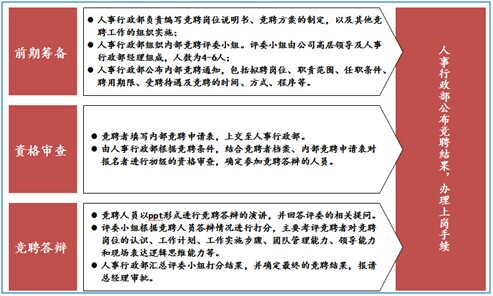 内部竞聘主要分为四大步骤,包括前期的筹备、资格审查、竞聘答辩及最终上岗。人事行政部负责前期的筹备,主要包括制定竞聘方案、发布公告、组建评审小组等;资格审查主要是人事行政部按照竞聘岗位的要求对员工竞聘申请表进行审查、筛选;竞聘答辩包括竞聘人进行竞聘陈述、评委小组进行提问等环节;最终,竞聘通过的人员由人事行政部安排上岗。
