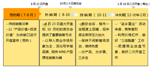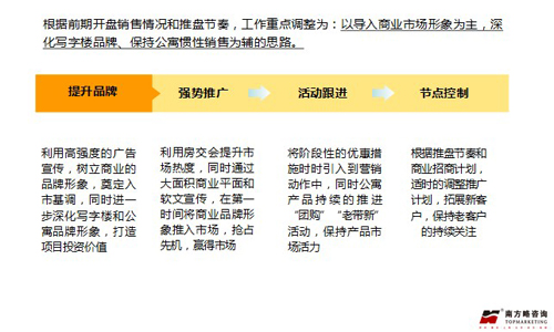 营销策略:根据开盘销售情况和推盘节奏,结合房交会重要销售节点,工作重点调整为:以导入商业市场形象为主,深化写字楼品牌、保持MNI户型惯性销售为辅的思路。