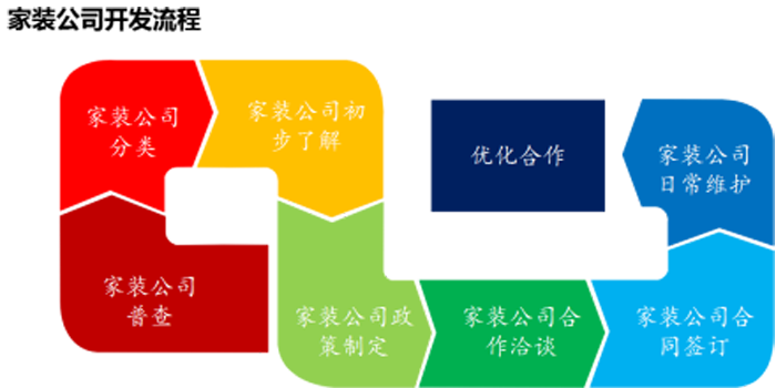 ◆举措四:家装突破。公司做全国性装修公司;联合经销商做区域龙头装修公司;经销商做中小装修公司。梳理装修公司开发流程: