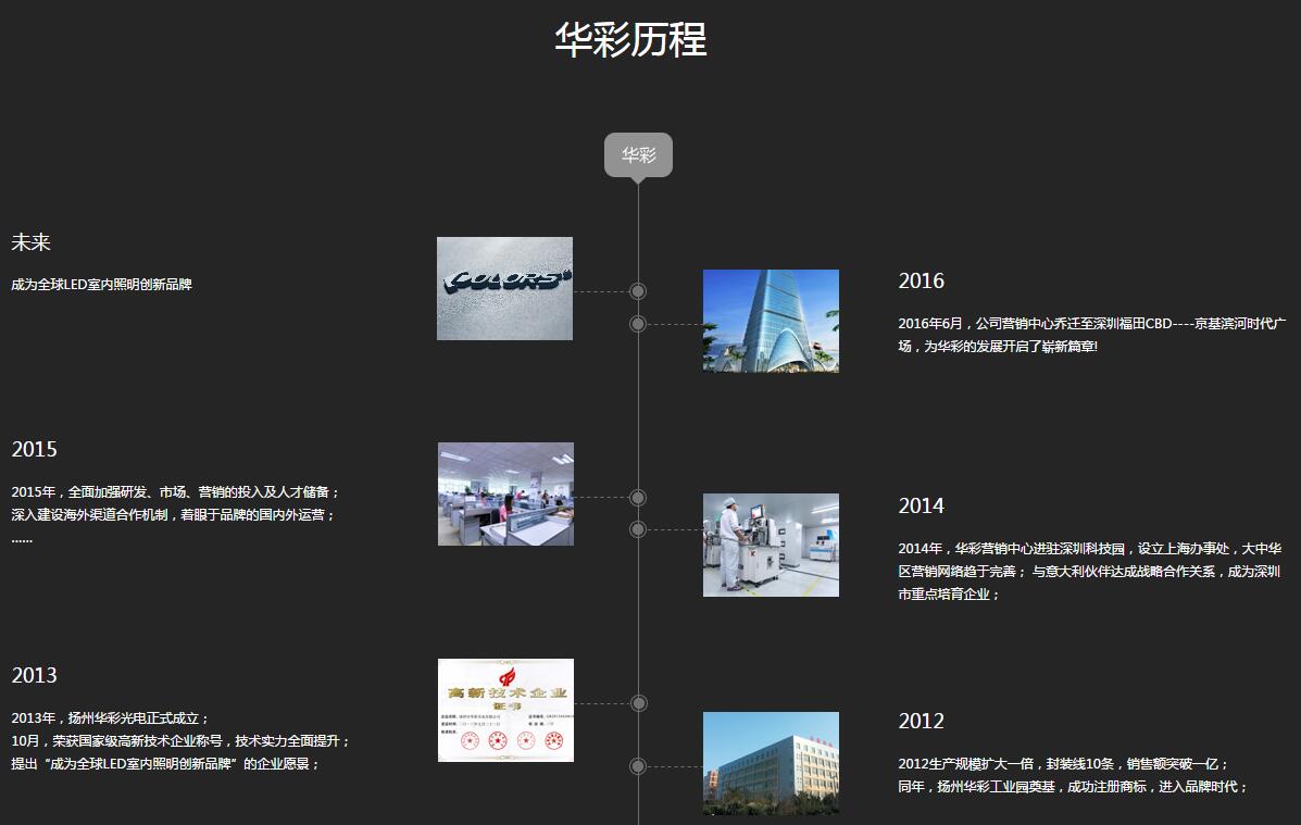 华彩以LED灯珠封装为基础,主要生产线形照明灯具、软硬灯带、电源等产品,在LED室内照明领域拥有领先的技术和生产实力。公司拥有职员工近500人,建设有完整稳定的R&D产品研发团队、QA品控体系、生产供应体系、先进的SMD、SMT等生产线和研发检测试验室,强大的营销客服团队服务客户遍及全球各个国家地区和国内各大城市,并在在俄罗斯、意大利、台湾、菲律宾、泰国等地区建有代理销售分支机构。